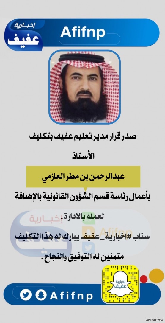 سناب #اخبارية_عفيف يبارك له هذا التكليف متمنين له التوفيق والنجاح .