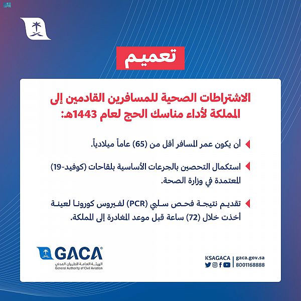 ونص التعميم على أن تلتزم جميع شركات الطيران الناقلة للمسافرين القادمين إلى المملكة لغرض أداء مناسك الحج لعام 1443هـ والتقيد بالإجراءات التالية: أن يكون المسافر أقل من (65) عاماً ميلادياً، وأن يستكمل التحصين بالجرعات الأساسية بلقاحات (كوفيد_19) المعتمدة في وزارة الصحة، وأن يقدم نتيجة فحص سلبي (PCR) لفيروس كورونا (كوفيد_19) لعينة أخذت خلال (72) ساعة قبل موعد المغادرة إلى المملكة.