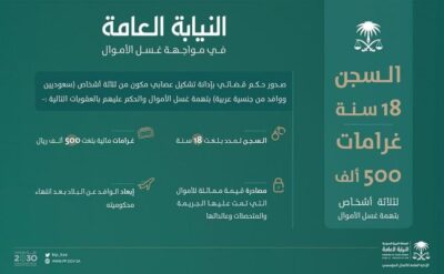 وقد تم إيقاف المتهمين، والادعاء عليهم أمام المحكمة المختصة، وتقديم الأدلة على اتهامهم، وصدر الحكم القضائي المتضمن إدانتهم بما نُسب إليهم، وأن الكيانات التجارية غطاء لتحويل الأموال مجهولة المصدر إلى خارج المملكة، والحكم عليهم بالسجن لمدد بلغت (18) سنة، وغرامات مالية بلغت (500.000) ريال، ومصادرة قيمة مماثلة للأموال التي تمت عليها الجريمة والمتحصلات منها وعائداتها، وإبعاد الوافد عن البلاد بعد انتهاء محكوميته.