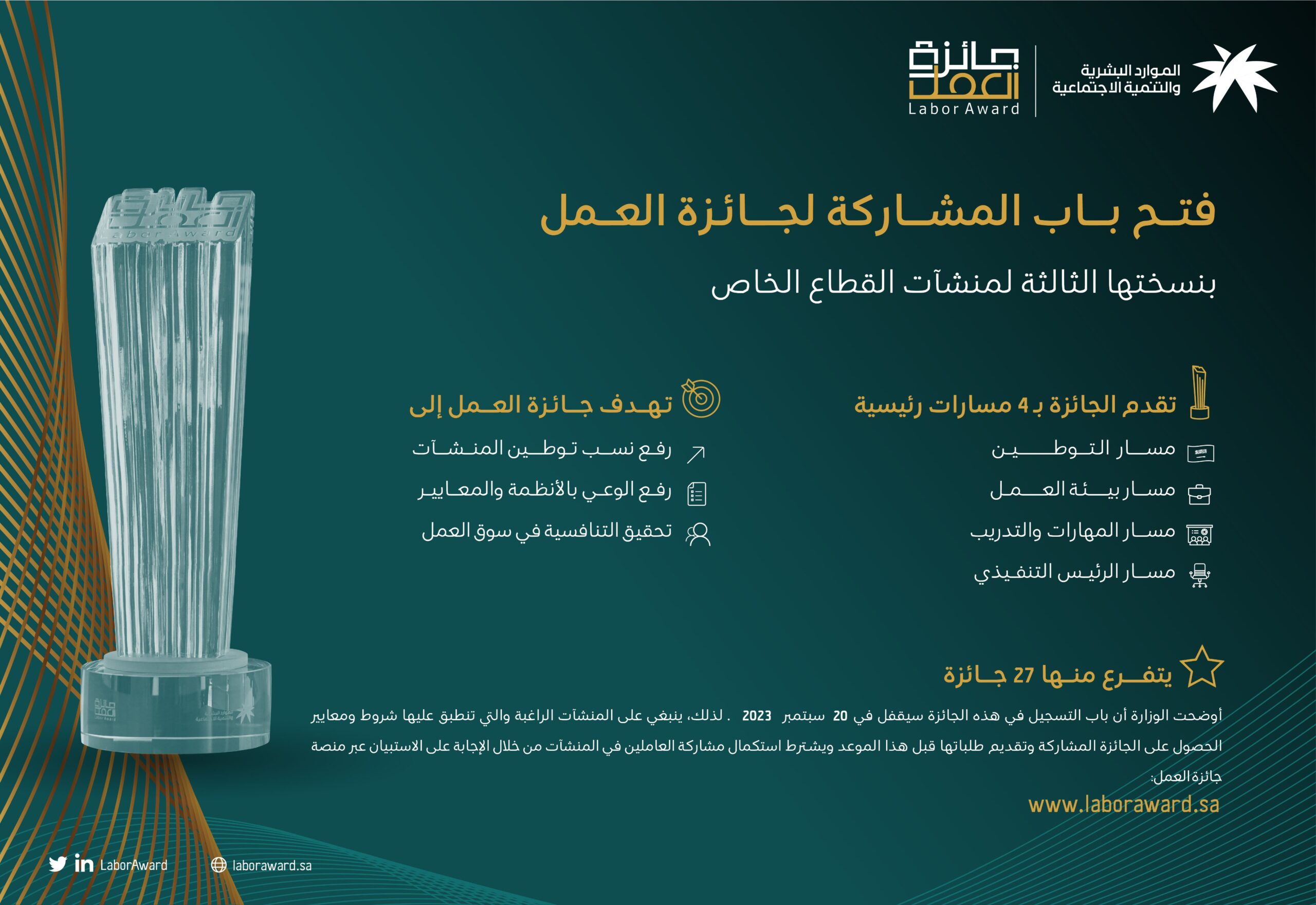 أعلنت وزارة الموارد البشرية والتنمية الاجتماعية عن فتح باب المشاركة في “جائزة العمل” بنسختها الثالثة لمنشآت القطاع الخاص, وذلك اعتبارًا من اليوم وحتى تاريخ 20 سبتمبر 2023.