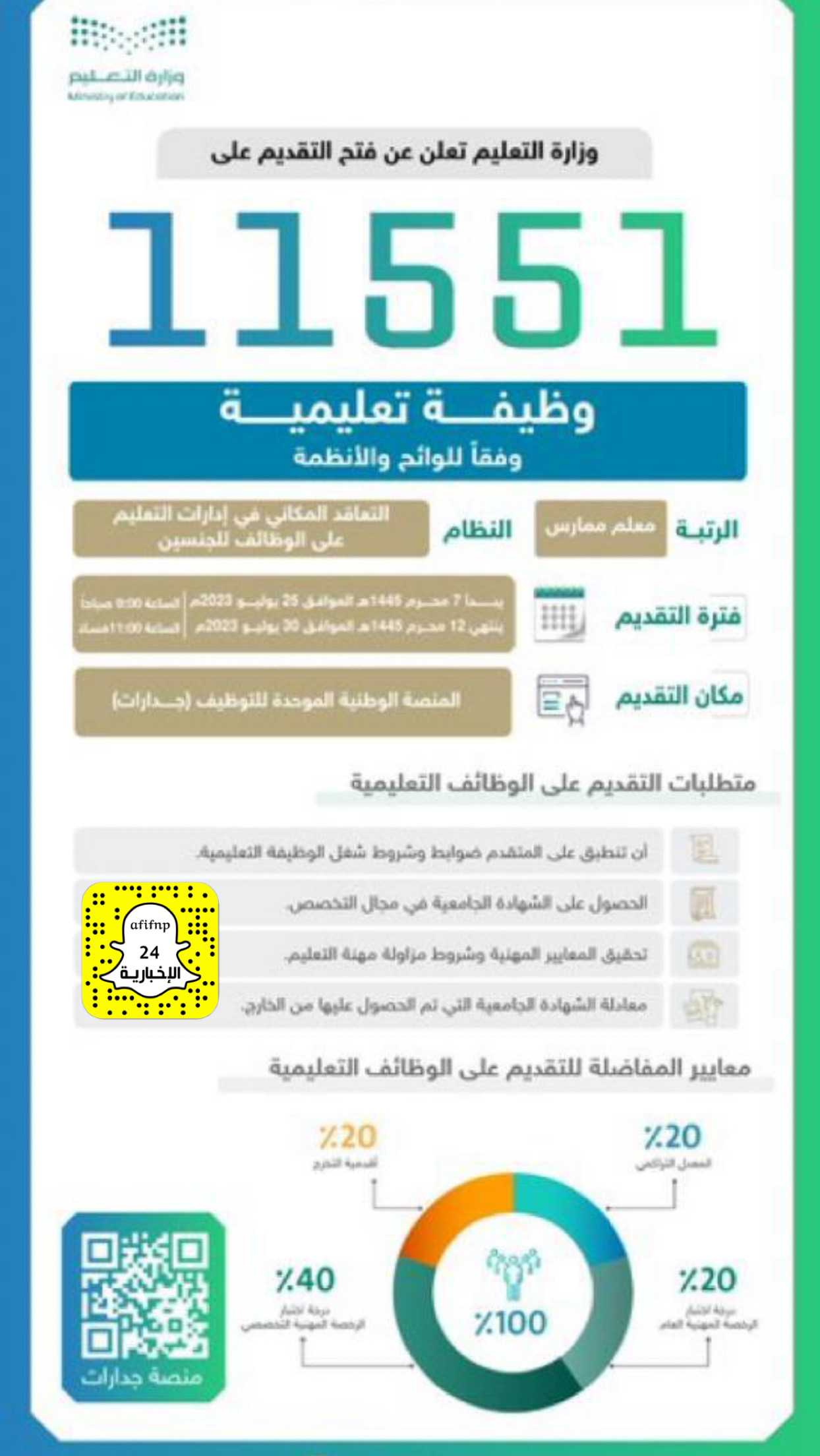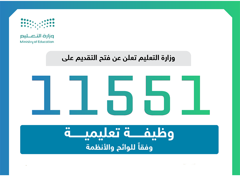 أعلنت وزارة التعليم عن وظائفها الشاغرة لعدد (11551) وظيفة تعليمية للعام الدراسي 1445هـ، في عدد من التخصصات في إدارات التعليم للجنسين بنظام التعاقد، من خلال المنصة الوطنية الموحدة للتوظيف ” جدارات” .