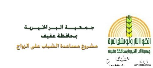 تعلن جمعية البر الخيرية بمحافظة عفيف عـن البدء في تسجيل طلبات الراغبين في مشروع مساعدة الشباب على الزواج وسيكون تقــديم الطلـبات ابتداءً من يوم السبت الموافق 12/3/1433هـ