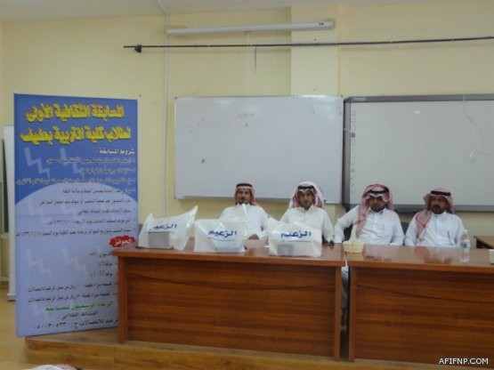 برعاية من سعادة عميد كلية التربية الدكتور سعود القوس وبدعم من محلات الزعيم للاتصالات قام قسم النشاط الطلابي بالكلية بتنظيم مسابقة ثقافية عامة للطلاب اشتملت على عشرة أسئلة متنوعة في مختلف التخصصات ، وشهدت المسابقة إقبال من الطلاب ، وتم تتويج الفائزون بالمسابقة يوم الإثنين الموافق 16/6/1433هـ وسلم الجوائز للطلاب الأستاذ سلمان حمد ورجل الأعمال الأستاذ مشاري معدي بن بديد ورجل الأعمال الأستاذ عبدالمحسن بن نامي