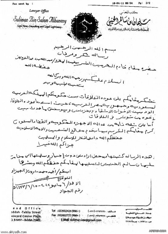 هذه الرسالة كتبتها بمحض إرادتي دون إجبار وسلمتها إلى المحامي سليمان سالم الحنيني لتسليمها لمقامكم حفظكم الله ونشرها.