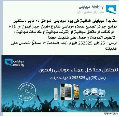 أعلنت شركة موبايلي عن مفاجأتها الثانيه في ( يوم موبايلي ) الموافق 25 مايو ، وستكون عبارة عن توزيع جوائز لجميع عملاء موبايلي مابين جهاز ايفوان او HTC او كنكت او دقائق مجانيه او مكالمات مجانيه ، لا تفوت الفرصه واحصل على هديتك مجانا ، ونوهت جميع العملاء بالاستفاده من المفاجأة بارسال : 25 الى 252525 اليوم ( بعد الساعه 12 مساء ) لتحصل على هديتك .