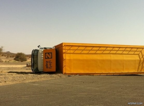 اصابة مقيم آسيوي في حادث انقلاب شاحنة نقل البضائع ( زاجل ) بالقرب من مفرق الجمانية