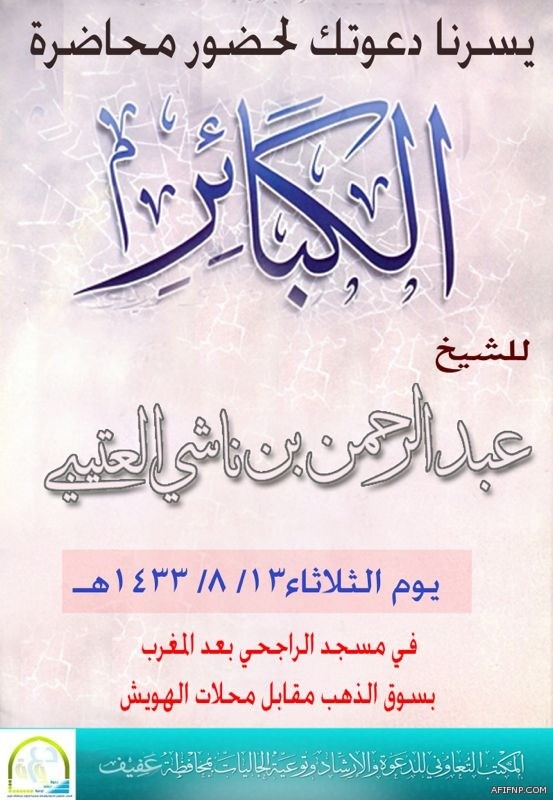 ضمن الجهود التي يقومبها المكتب التعاوني بمحافظة عفيف وضمن سلسلة المحاضرات بمسجد الراجحي يقيم المكتب محاضرة بعنوان الكبائر للشيخ عبدالرحمن بن ناشي العتيبي يوم الثلاثاء13/ 8 / 1433 .