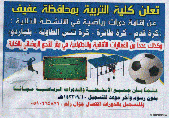 تعلن كلية التربيه بمحافظة عفيف عن اقامة دورات رياضيه في الانشطه التاليه :