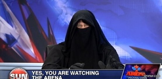 ظهر أحد مقدمي البرامج التلفزيونية في قناة صن نيوز الكندية، وهو يرتدي ثوبا اسود وغطاء وجه (نقاب) لا يظهر منه سوى عينيه وقفازات.