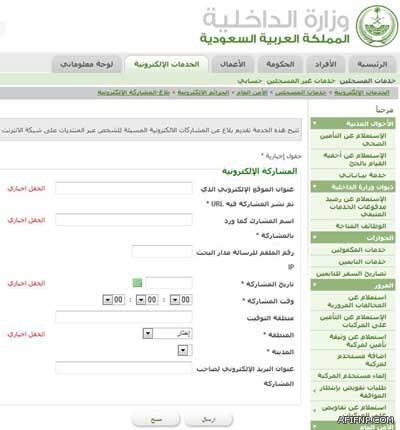 أتاح موقع وزارة الداخلية خدمة التبليغ الإلكتروني عن المشاركات المسيئة في المنتديات ومواقع التواصل الاجتماعي على شبكة الانترنت حيث اصبح بإمكان الشخص الابلاغ عن أي مخالفة يراها في أحد المواقع أو المنتديات وذلك بإرسال عنوان الموقع الإلكتروني عبر موقع وزارة الداخلية [url]www.moi.gov.sa[/url] .