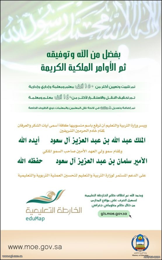 خصصت وزارة التربية والتعليم صفحة كاملة عبر موقعها الالكتروني تحكي به مبتهجة ما حققته من انجاز في مسيرتها التعليمية الماضية بفضل الله ثم بفضل الاوامر الملكية الكريمة وذلك من تثبيت وتعيين اكثر من 150 ألف معلم ومعلمة واداري وادارية اضافة إلى ماتم تحقيق لاكثر من 140 الف معلم ومعلمة من النقل والاستقرار غير ذلك من اضافة وتعديل 8 حالات في لائحة نقل المعلمين والمعلمات ذوي الظروف الخاصة .