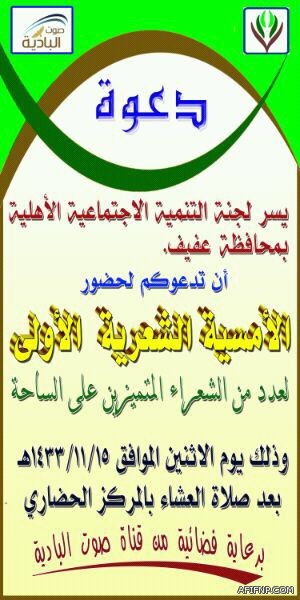 يسر لجنة التنمية الإجتماعية الأهلية بمحافظة عفيف أن تدعوكم لحضور الأمسية الشعرية الأولى