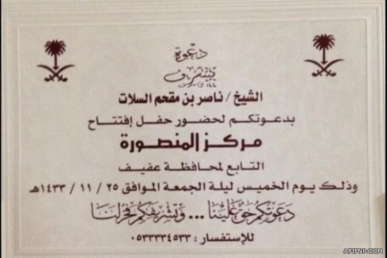 دعى الشيخ : ناصر بن مقحم السلات لحضور حفل افتتاح مركز المنصوره التابع لمحافظة عفيف والذي سيتم بمشيئة الله بحضور عدد من أصحاب السمو الأمراء ومحافظ عفيف وشيوخ وأعيان القبائل ورؤساء المراكز ورؤساء الدوائر الحكوميه وذلك في يوم الخميس ليلة الجمعه 25 / 11/ 1433 هـ .. اخبارية عفيف ستتواجد بالموقع لتنقل وقائع حفل الافتتاح حصريا بالصور والفيديو .