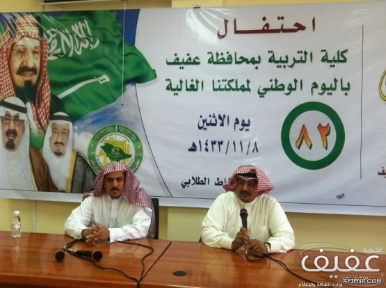وطلابها ، احتفلت كلية التربية بعفيف باليوم الوطني وذلك يوم الاثنين الموافق 8/11/1433. وبدأ الاحتفال بآيات عطرة من القرآن الكريم،