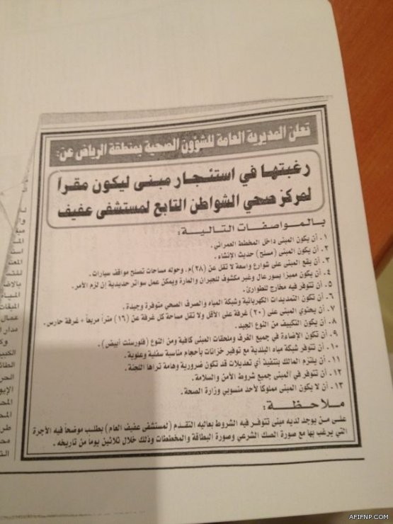 تعلن المديرية العامة للشئون الصحية بمنطقة الرياض عن رغبتها باستئجار مبنى حديث ليكون مقرا لمركز صحي الشواطن التابع لمستشفى عفيف العام حسب الشروط والمواصفات المذكورة في الإعلان المرفق وذلك خلال مدة أقصاها 15 يوم من تاريخه: