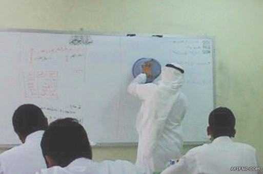 تناقل مستخدمو برنامج التواصل الاجتماعي «فيس بوك» الفترة الماضية القريبة، صورة لأحد المعلمين في مادة الرياضيات أثناء شرحه درساً للأشكال الهندسية في الفصل، مستخدماً «سلة نفايات» كي يرسم دائرة، حيث اتضح عدم وجود أداة مناسبة لذلك.