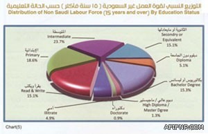 وبينت النتائج أن الأفراد الحاصلين على شهادة البكالوريوس أو الليسانس يمثلون أعلى نسبة من قوة العمل السعودية إذ بلغت 31.2% ، يليهم الحاصلون على شهادة الثانوية أو ما يعادلها بنسبة 31% ، ومثل الذكور الحاصلون على الشهادة الثانوية أو ما يعادلها أعلى نسبة بين قوة العمل السعودية الذكور حيث بلغت 35.5% ، بينما تركزت هذه النسبة بين الإناث الحاصلات على شهادة البكالوريوس أو الليسانس إذ بلغت 66.9% .