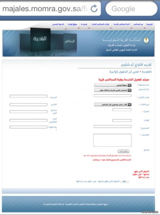 فتحت وزارة الشؤون البلدية والقروية ممثلة في الإدار العامة لشؤون المجالس البلدية خدمة تواصل إلكترونية يتاح من خلالها للمواطنين التقدم للمجلس البلدي في منطقتهم او محافظتهم تقديم الاقتراحات والشكاوى الكترونياً عبر موقع الوزارة ويتم تحويل الطلب الكترونياً لأعضاء المجلس المعني لدراسته حسب النظام.