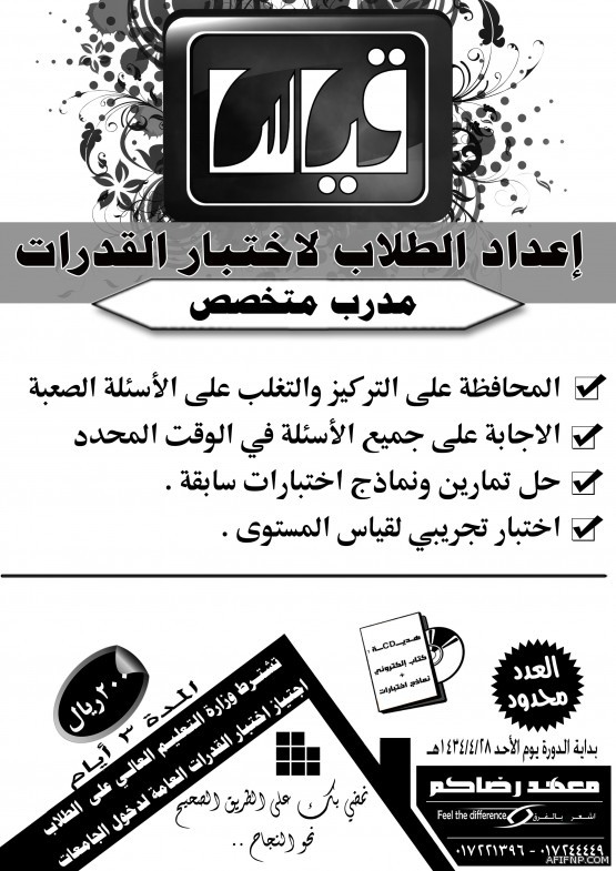 أخبار تعليم عفيف > معهد رضاكم للتدريب بمحافظة عفيف يدعوا للتسجيل في دورة “اعداد الطالب لاختبار القدرات” ( العدد محدود )