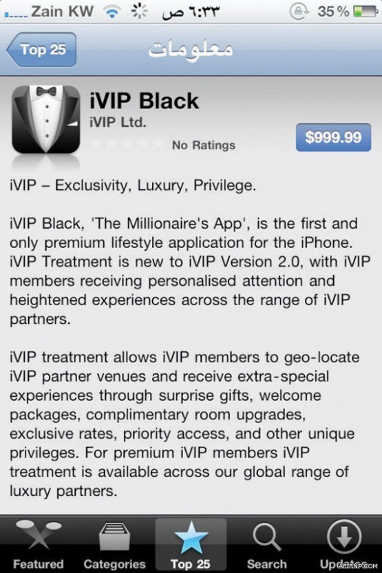 إن كنت من أصحاب الدخل المرتفع الذي يفوق المليون، أو تملك ثروة مالية عالية، فإن ذلك يخولك الحصول على أغلى التطبيقات في متجر أبل وهو iVIP Black والذي يبلغ سعره 999.99 دولار أي ما يعادل 3751 ريالا سعوديا.