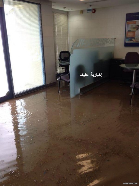 تسربت مياه الأمطار عصر هذا اليوم السبت الموافق 17 / 6 / 1434هـ الى داخل بنك الراجحي بعد ارتفاع منسوب المياه في الشارع العام الذي تجتمع فيه جميع شوارع المحافظة ، حيث حاول موظفي البنك رفع الأجهزة والاوراق خوفا من تلفها داخل البنك .