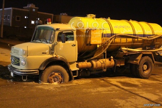 تعرض صهريج مياه عقب الأمطار الغزيره التي شهدتها محافظة عفيف مساء يوم (الأحد) للسقوط في الشارع المقابل لمحطة العبور بينما كان ينوي سحب المياه المترااكمه في الشارع, ويظهر في الصوره انهيار “حفرية الصرف الصحي بجانب محطة العبور” وهي الحاله الثالثه بعد شارع السلام ودائري السليمانيه.