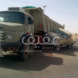وقع عند الساعه التاسعه صباح اليوم الخميس حادث تصادم لـ مركبتين نوع ( شاحنه نقل ثقيل يقودها وافد من الجنسيه البنغاليه, و جيب شاص يستقله مسنّ في العقد الخامس من عمره ) حيث سجّل الحادث اصابات سطحيه لقائد الشاص ونُقل بواسطة الهلال الأحمر لمستشفى عفيف العام وأجريت له الفحوصات الطبيه التي أكدت سلامته, باشر الموقع فرقه من المرور والهلال الأحمر.