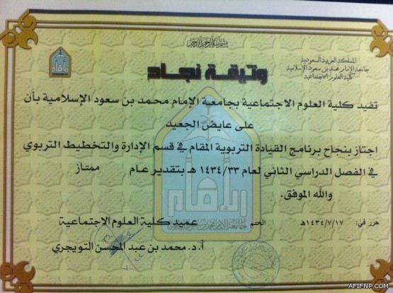 حصل الأستاذ علي بن عايض الجعيد مدير ثانوية القدس بعفيف على وثيقة النجاح من من كلية العلوم الاجتماعيه من جامعة الإمام محمد بن سعود الإسلاميه, وذلك نظير اجتيازه بإمتياز لبرنامج القياده التربوية المقام في قسم الاداره والتخطيط الفصل الدراسي الثاني من العام المنصرم, اخبارية عفيف تبارك لأبو مناف وتتمنى له التوفيق في حياته العلميه والعمليّه.