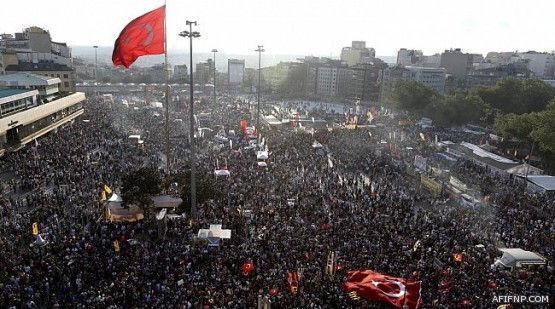 لكن آلاف الأتراك تحدوا الدعوة التي وجهها اردوغان يوم الجمعة لوقف المظاهرات المناهضة للحكومة فورا وتجمعوا مرة أخرى في ميدان تقسيم بوسط اسطنبول حيث اشتبكت قوات الأمن المدعومة بطائرات هليكوبتر وعربات مدرعة مع المحتجين قبل أسبوع، وزاد السائحون والمارة أعداد المحتجين المعتصمين في مخيم الاحتجاج في متنزه جيزي حيث أمضى ناشطون الليل في خيام وحافلات مدمرة أو تدثروا بأغطية تحت الأشجار، وقال مسؤولون في حزب العدالة والتنمية انهم ناقشوا الدعوة لتجمع حاشد لأنصارهم في اسطنبول أو انقرة هذا الاسبوع ولكن لم يتم اتخاذ قرار بعد مع حث بعض الشخصيات في الحزب على ضبط النفس خشية اثارة الوضع في الشوارع.