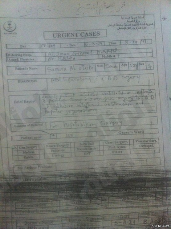 وكانت السيدة قد أدخلت لمستشفى عفيف لإجراء عملية منظار لإزالة حصوات في المرارة ، وقام الأطباء بقطع القناة الصفراوية الجامعة بالخطأ ؛ وبالتالي تدهورت الحالة الصحية للمواطنة .