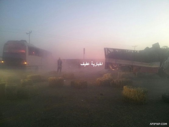 وقع صباح اليوم السبت حادث اصطدام حافلة ركاب(نقل جماعي) وشاحنه نوع(دينا محملّه بالأعلاف) بمركز المعلق شرق محافظة عفيف, اصيب خلاله ٤٥ شخصاً باصابات متفرقة بينهم مقيم تعرض لحروق من الدرجة الثانية وكسور اثر التصادم الذي وقع وجهاً لوجه.