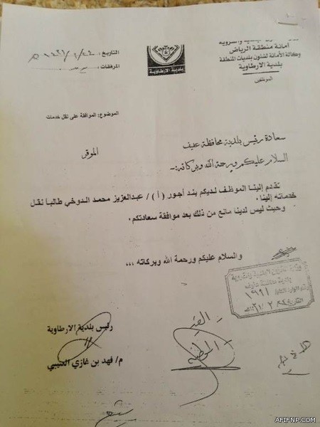 وسرد الموظف المفصول عبدالعزيز محمد الغنامي لـ “إخبارية عفيف” قضيته وقال: “تقدمت بطلب نقل لبلدية الأرطاوي وجاءت الموافقة لبلدية عفيف بتاريخ 24/ 3/ 1431هـ وجاءت موافقة بلدية عفيف على نقلي وإخلاء طرفي في نفس اليوم وبالخطاب رقم 1265/ ط/ 31. وأضاف: تفاجأت أن بلدية عفيف قد اتخذت قراراً آخر بطي قيدي وإنهاء خدماتي بتاريخ 22/ 3/ 1431هـ، أي قبل الموافقة على نقلي وإخلاء طرفي بيومين”.
