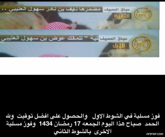 [COLOR=#050505][SIZE=5][FONT=Simplified Arabic]في كل عام تقام سباقات الهجن الاصايل بالطائف وبحضور من جميع ملاك ومحبي رياضة الهجن من جميع دول الخليج العربي للمشاركه والمتابعة وقد أقيم السباق في يوم السابع عشر من رمضان لهذا العام وبتوفيق من الله تم انتزاع المركز الاول بالشوط الرئيس الاول لاهالي محافظة عفيف على ظهر الذلول (مسلية ) للسيد عوض بن سهول المهيدلي العتيبي وبقيادة المضمر نايف بن نادر سهول المهيدلي العتيبي