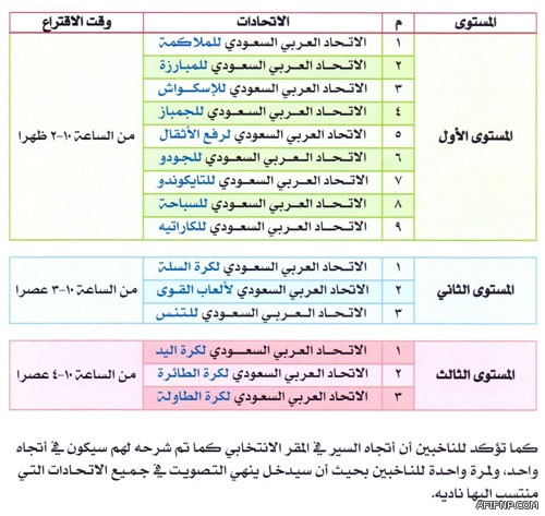 وكانت اللجنة السعودية الأولمبية قد شكلت العديد من اللجان المختلفة ومنها اللجنة التنفيذية وعملها الاشراف الكامل على عملية تسجيل المرشحين والناخبين وكافة الامور التنظيمية برئاسة محمد القدادي، واللجنة العامة وعملها العد والفرز بعد عملية الاقتراع برئاسة القانوني صالح الخضر، وكذلك لجنة الطعون وعملها استقبال الطعون والاستئناف بعد عملية الاقتراع)، كما أن اللجنة التنفيذية أهم اللجان وتعمل ليلاً نهاراً منذ شهرين لضمان نجاح الانتخابات التي تعبر لغة حضارية ستساهم بإذن الله في عودة الانجازات السعودية. كما أن اللجنة التنفيذية وبمتابعة مستمرة من الامير نواف بن فيصل الرئيس العام لرعاية الشباب قامت على وضع آلية لكافة الناخبين في 15 اتحاداً بخلاف اتحاد المصارعة الذي لم يتقدم له أحد، بينما وصول أربعة مرشحين فقط في اتحاد الدراجات. وحرص اللجنة على ضمان سلامة الناخبين والإدلاء بأصواتهم في أجواء انتخابية منظمة حيث سيفتح باب التصوييت للاتحادات الرياضية التالية ( الملاكمة والمبارزة والاسكواش والجمباز ورفع الاثقال والجودو والتايكوندو والسباحة والكاراتيه) من الساعة العاشرة صباحاً وحتى الساعة الثانية ظهراً، على أن يكون وقت اقتراع اتحاد السلة وألعاب القوى والتنس الارضي من الساعة العاشرة صباحاً وحتى الساعة الثالثة ظهراً. بينما يكون موعد اقتراع اتحادات اليد والطائرة والتنس الطاولة من الساعة العاشرة صباحاً وحتى الساعة الرابعة عصراً. كما أكدت اللجنة التنفيذية للانتخابات لكافة الناخبين الذي وصل عددهم إلى 159 ناخباً بأن اتجاه السير لصناديق الاقتراع باتجاه واحد ولا يحق للناخب معاكسة السير، كما أن الناخبين في جهة والمرشحين الذي وصل عددهم إلى 180 مرشحاً في الجهة المقابلة ويحق للمرشحين أيضاً الجلوس في المقاعد القريبة من صناديق الاقتراع اثناء عملية الفرز لضمان عدم التلاعب في عملية فرز الاصوات التي وصل عددها إلى 477 صوتاً.