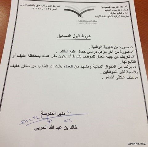 ونوّه مدير المدرسة الأستاذ خالد عبدالله الحربي الى الراغبين في التسجيل ضرورة توافر الشروط للقبول بالمدرسة.