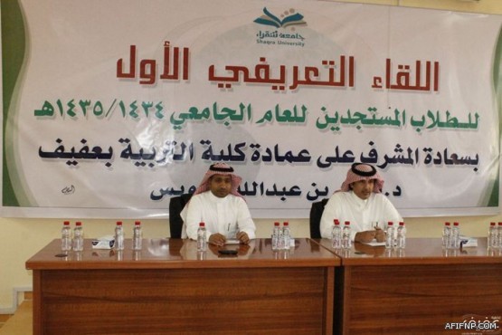 التقى سعادة المشرف على عمادة كلية التربية بعفيف الدكتور فيصل الرويس الطلاب المستجدين بكلية التربية وذلك بحضور الدكتور محمد خزيم الشمري وكيل الكلية لشوؤن التعليمية وعداا من أعضاء هيئة التدريس واستهل الدكتور فيصل اللقاء التعريفي للطلاب المستجدين بالترحيب بهم مبينا لهم اهداف ورسالة الكلية واقسامها ونظام الدراسة بها وحث الطلاب على الالتزام بأنظمة الكلية والحرص والمواظبة على الحضور لطلب العلم لخدمة الدين والمليك والوطن من جانبه اكد الدكتور محمد الشمري على الحرص على الجد والاجتهاد والظهور بالصورة المشرفة والحصول على اعلى الدرجات للحصول على المراتب العليا، وفي نهاية اللقاء اجاب الدكتور فيصل والدكتور محمد الشمري على اسئلة الطلاب واستفساراتهم .