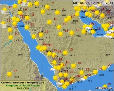 توقّعت الرئاسة العامة للأرصاد وحماية البيئة في تقريرها عن حالة الطقس اليوم ـ بمشيئة الله تعالى ـ سماء غائمة جزئياً على أجزاء من جنوب وغرب المملكة تتخللها سحب ركامية رعدية على مرتفعات (جازان, وعسير) تمتد حتى مرتفعات الباحة ، مع نشاط في الرياح السطحية تحد من مدى الرؤية الأفقية على شرق وأجزاء من وسط المملكة.