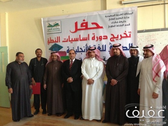 وقد بدأ الحفل بآيات من الذكر الحكيم تلاها الطالب : محمد حكمات الساطي ثم كلمة الطلاب القاء نيابة عنهم الطالب نواف نايف العتيبي ثم كلمة العميد وشكر فيه جميع من شارك أنشطة الكلية للفصل الاول ثم عقبها محادثة باللغة الانجليزية بين طالبين للتعرف على اساسيات النطق.