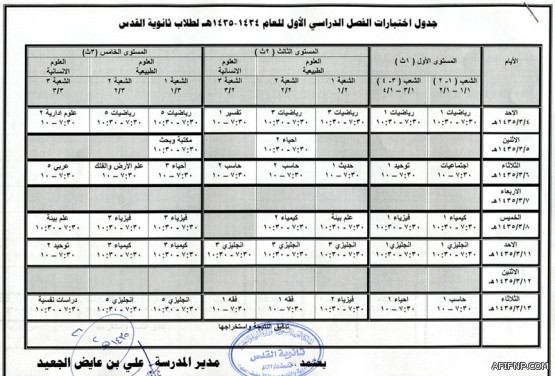 أخبار تعليم عفيف > ثانوية القدس تعلن جدول اختبارات الفصل الدراسي الأول للعام 1434-1435هـ