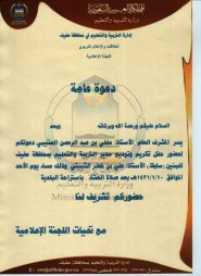 يسر المشرف العام الأستاذ/ ملفي بن عبدالرحمن العتيبي دعوتكم لحضور حفل تكريم وتوديع مدير التربية والتعليم للبنين سابقا الأستاذ/ علي بن خضر الثبيتي . بحضور محافظ عفيف