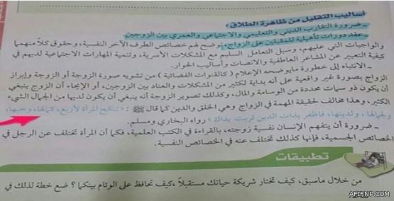 وأورد الكتاب (طبعة 1434- 1435 هـ) في أحد موضوعاته بالصفحة رقم (87) الحديث الشريف بالنص التالي: (قال صلى الله عليه وسلم: ?تنكح المرأة لأربع، كمالها، وحبها، ولجمالها، ولدينها، فاظفر بذات الدين تربت يداك? رواه البخاري ومسلم).