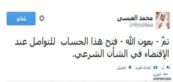وقال في تغريدته الأولى: ?تمَّ ? بعون الله ? فتح هذا الحساب للتواصل عند الاقتضاء في الشأن الشرعي?.