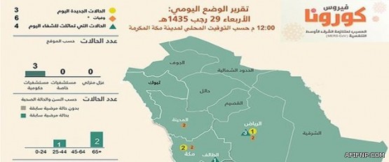 حالة وفاة لامرأة تبلغ من العمر 80 سنة, أدخلت إلى مستشفى حكومي بالرياض وهي من الحالات المسجلة سابقا بتاريخ 24/ 5/ 2014. وقد وافتها المنية بتاريخ 28/ 5/ 2014. تغمدها الله بواسع رحمته.