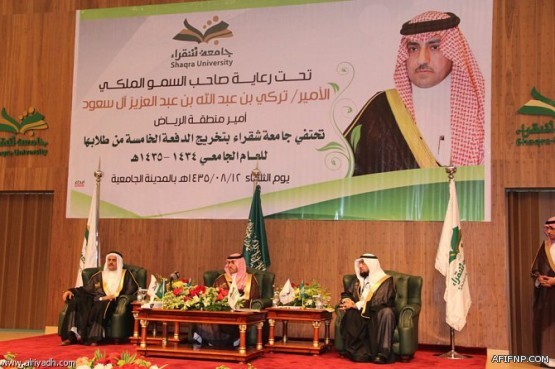 زف صاحب السمو الملكي الأمير تركي بن عبدالله بن عبدالعزيز أمير منطقة الرياض يوم امس الثلاثاء (4553 ) طالبا وطالبة من طلبة جامعه شقراء لممارسة حياتهم العملية خلال حفل تخريج الطلبة(الدفعة الخامسة) للعام الجامعي 1434/1435. هذا وكان سمو أمير منطقة الرياض قد وصل الى مقر محافظة شقراء قبل ظهر يوم امس وكان في استقباله محافظ شقراء محمد بن سعود الهلال ومعالي مدير جامعة شقراء الأستاذ الدكتور خالد بن سعد بن سعيد ووكيل المحافظة الأستاذ مشعل بن ساعد العميري والشيخ محمد بن عبدالعزيز الجميح والشيخ محمد بن حمد العيسى والشيخ حمد بن عبدالعزيز الجميح ومحافظو القويعية وعفيف والمزاحمية وحريملاء وثادق ومرات ورؤساء المراكز وأعيان وأهالي شقراء.