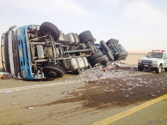 ادت السرعة وعدم انتباه سائق شاحنة محملة بعبوات مياه إلى إنقلابها صباح اليوم وإصابة قائدها بإصابات متوسطة على طريق عفيف – ضرية بالقرب من مركز الحمادة.