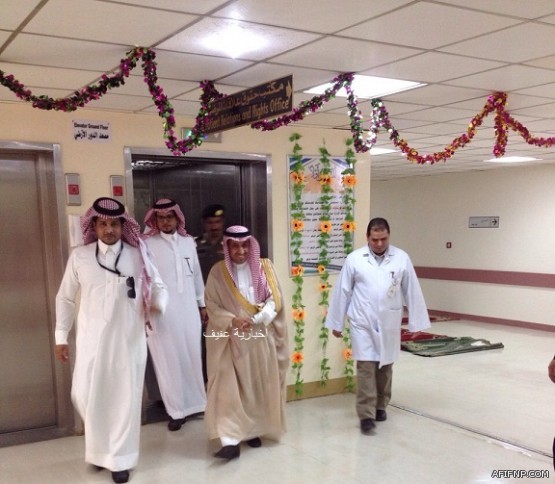 قام وكيل محافظ عفيف الاستاذ ابراهيم المنقور يرافقه مساعد مدير شرطة عفيف الرائد حمود حزام العتيبي والاستاذ فواز العطاوي بزيارة لمستشفى عفيف العام ، وكان في استقبالهم مدير مستشفى عفيف المكلّف خلال اجازة عيد الأضحى الاستاذ عبدالكريم السلات والمدير الطبي الدكتور احمد عبدالغني ونائب رئيس قسم الصيانة الاستاذ مقبل المهيدلي وعدد من منسوبي المستشفى والطاقم الطبي والتمريضي حيث تناول المنقور الافطار مع منسوبي المستشفى ثم عايد المرضى المنوّمين وقدّم لهم الهدايا بمناسبة عيد الاضحى المبارك ودعى لهم بالشفاء العاجل.