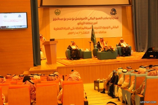 برعاية صاحب السمو الامير بندر بن سعود بن محمد ال سعود اقامت الهيئة السعودية لحماية الحياة الفطرية مساء يوم الثلاثاء الموافق 26/5/ 1436هـ برنامج توعوي وفعليات ، حيث انطلق البرنامج بإفتتاح صاحب السمو الأمير بندر بن سعود بن محمد رئيس الهيئة السعودية لحماية الحياة الفطرية معرض توعوي لتحنيط الحيوانات المنقرضة واسمع للشرح مفصلاً وذلك في مدرسة عبد الرحمن الداخل المتوسطة ومن ثم انتقل الى مسرح إدارة التربية والتعليم وبداء البرنامج بأيات من الذكر الحكيم تلاها الأستاذ فارس ثم عقبها محاضرة للشيخ عبد العزير العسكر امام جامعة الدرعية بالرياض محاضرة عن حقوق الحيوان وشروطها ، عقبها كلمة عبد العزير القثامي مدير محمية العريق وسجاء وعرض برجوكتر لجميع انشطة الرئاسة وشرح عن اهمية المحافظة على الهيئة الفطرية “بعنوان لماذا نحافظ ” وايضا عن المشاكل الصيد ولأحتطاب الجائر والنبتات الذي تؤدي الى تعرية التربة وفيلم وثائقي عن الحياة الفطرية ، واختتم الحفل بكلمة صاحب السمو الأمير بندر بن سعود بن محمد رئيس الهيئة السعودية لحماية الحياة الفطرية تحدث فيها عن التعامل مع الحياة الفطرية في العصر الماضي والأستغلال الحسن وتكلم عن اغنى محمية في المملكة واكد حرص المواطن على هذة الحيوانات ولابد من المحافظة على ثروة البيئة الفطرية وذكر لابد من استثمار البيئة الفطرية ويداً بيد مع رجال الحياة الفطرية ، ثم استمع سمو الامير لمداخلات الحضور واجاب عن استفساراتهم ، ومن ثم تناول الجميع مأدبة عشاء ،