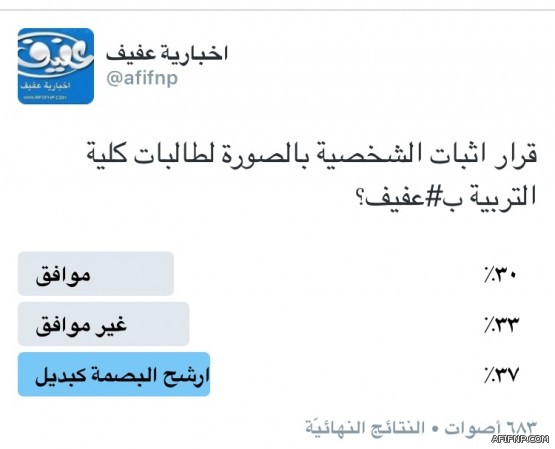 وضعت اخبارية عفيف استطلاعاً على برنامج التواصل الاجتماعي تويتر حول موضوع قرار كلية التربية بالزام الطالبات بالصورة الشخصية لوضعها في البطاقة الجامعية او بطاقة ورقية تحتفظ بها الطالبة بنفسها والتي لاقت تذمر كبير من اولياء الامور جراء كون القرار عشوائي ولا يخدم العملية التربوية وكون بطاقة الاحوال اختياري وليس اجباري , مع وجود حلول اخرى غير الصورة الشخصية .