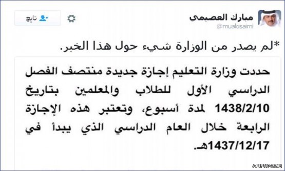وقال العصيمي عبر حسابه على تويتر :”لم يصدر عن التعليم أي شيء بهذا الخصوص”