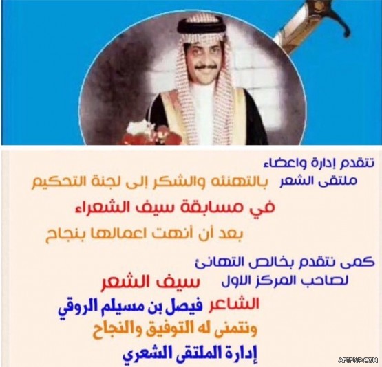 حصل الشاعر : فيصل بن مسيلم الروقي على المركز الأول في مسابقة سيف الشعراء التي ينظمها ملتقى الشعر في برامج التواصل الاجتماعي تويتر وذلك بعد مشاركته بقصيدة حققت المركز الأول .